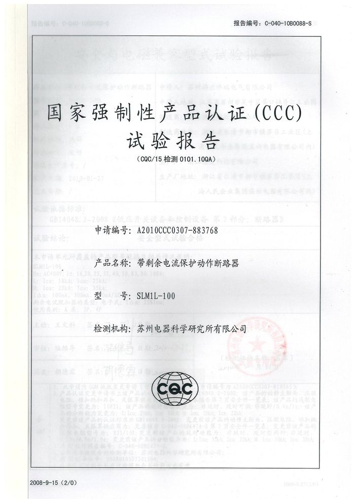 SLM1L-100塑殼斷路器資質(zhì)證書(shū)