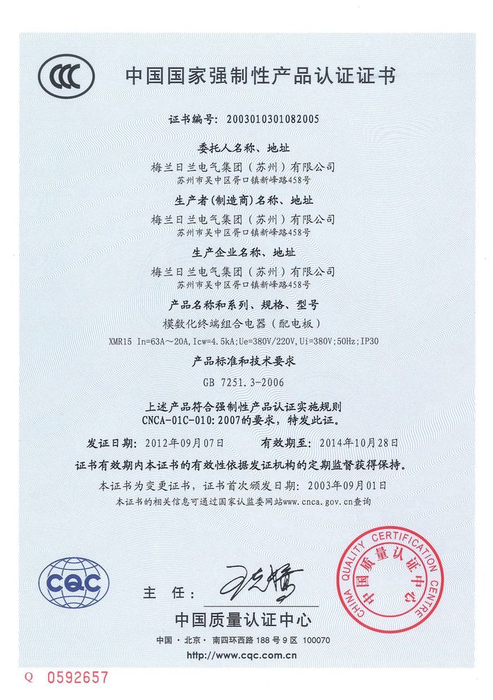 (成套)XMR15 模數(shù)化終端組合電器資質(zhì)證書