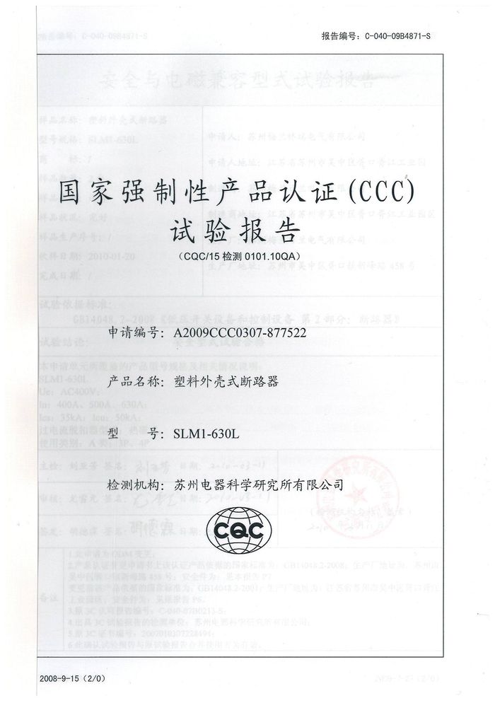 SLM1-630L塑殼斷路器資質(zhì)證書(shū)
