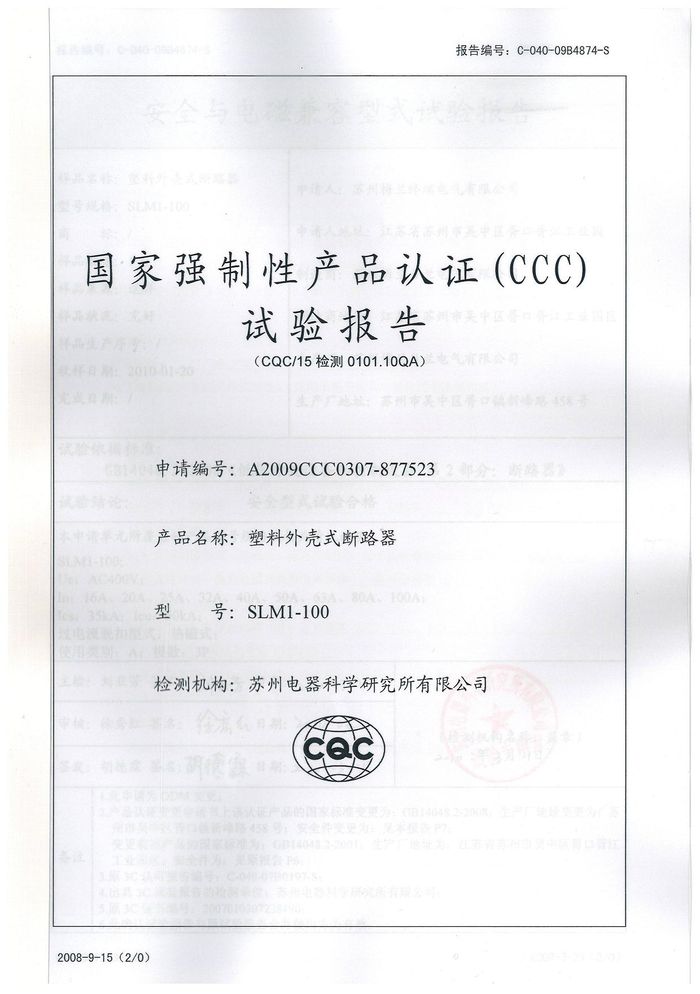 SLM1-100塑殼斷路器資質(zhì)證書