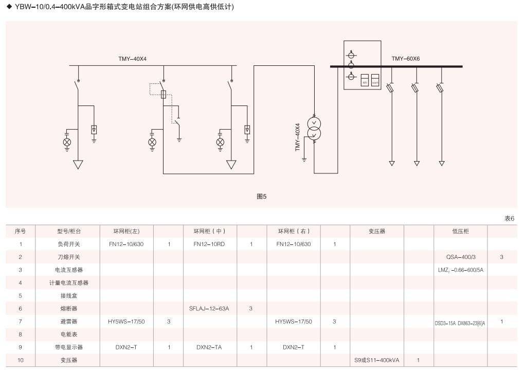 本變電箱高、低壓?jiǎn)卧捎媒M合式柜.按所需要接線組合成高、低壓配電系統(tǒng)常用高、低壓柜的接線方案均可選用,同時(shí)高壓?jiǎn)卧挚山M合成環(huán)網(wǎng)型式等。(見(jiàn)表4、表5)