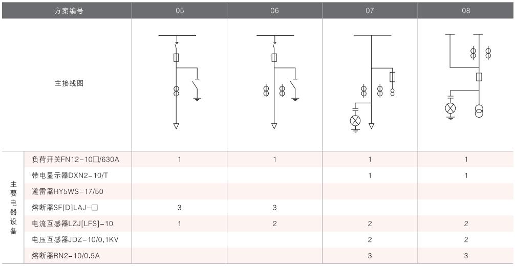 表6~列舉了一些典型組合接線方案,供用戶和設(shè)計(jì)單位參考。(以配裝壓氣式負(fù)荷開(kāi)關(guān)為例)