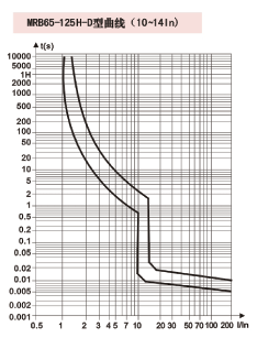 可靠接觸指示 快速閉合 脫扣特性: 口D型曲線: (10-14) In瞬時脫扣 機械壽命:不低于10000次 耐沖擊電壓:6KV 隔離性能:可靠 抗?jié)駸嵝裕?br />2類(溫度55℃時,相對濕度為95%) 接線: 采用帶夾箍的接線端子,固定電纜截面可達: 50 FTIFT12 輔助裝置: 可配各種輔助裝置,其中包括MRB65LE附件 脫扣特性曲線